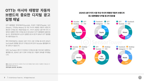 OTT 플랫폼은 ‘현대자동차’, ‘토요타 자동차’, ‘닛산(Nissan)’, ‘기아’ 등 주요 아시아-태평양 자동차 브랜드의 중요한 디지털 광고 채널이었다. 기아가 2024년 1분기에 미국 시장에서 집행한 전체 디지털 광고비 중 62%가 OTT 플랫폼에 집중됐다. ‘현대자동차’와 ‘닛산’이 집행한 광고비 중 약 30%가 OTT 플랫폼에 사용됐다.