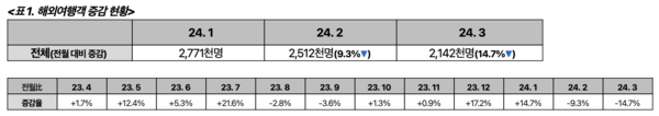 관광지식정보시스템, 3월 해외여행객 2월 대비 14.7%(251만명→214만명) 감소… 1년새 가장 큰 낙폭 기록