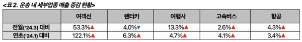 운송 업종 매출 전월 대비 4% 증가… 여객선 관련 매출 53% 급증하는 등 국내 여행 매출 증가 확인