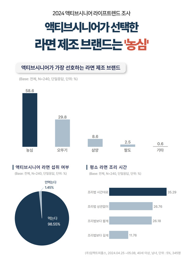 시니어 소셜벤처 임팩트피플스은 4월 25일부터 5월 8일까지 40세 이상 남녀 345명을 대상으로 진행한 ‘2024년 액티브시니어 라면 섭취 형태 및 선호 브랜드 조사’ 결과를 발표했다.