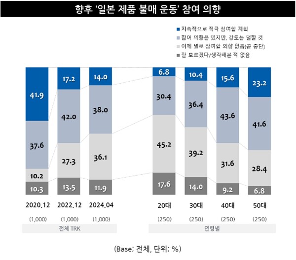 또한 지난 불매운동 열풍을 감안하면 금세 시들어진 대중들의 소비 태도가 실망스럽게 느껴진다(50.3%(2022) ▶ 25.7%(2024))거나 불매운동이 지속되어야 한다고 생각한다(42.0%(2022) ▶ 21.6%(2024))는 응답이 이전 조사 대비 감소하는 등 불매 운동 자체에 대한 필요성이 낮아진 모습까지 살펴볼 수 있었는데, 이에 따라 향후 불매 운동 참여 의향 또한 크게 약해진 결과를 확인할 수 있었다(41.9%(2020) ▶ 17.2%(2022) ▶ 14.0%(2024)).