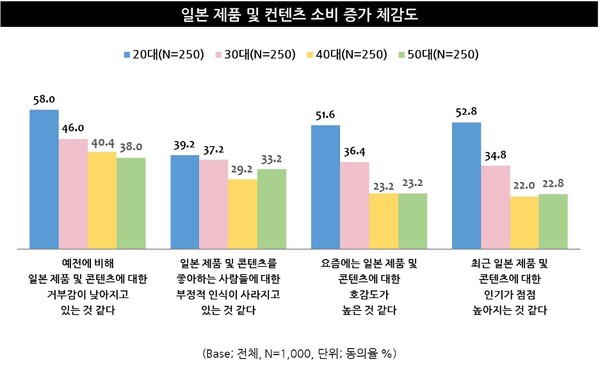 일본 제품 불매 운동에 대한 공감대가 낮아지고 있다는 사실은 최근 1년 이내 일본 제품 구매(61.7%) 및 일본 콘텐츠 이용 경험(65.6%)을 통해서도 살펴볼 수 있었다. 특히, 저연령층을 중심으로 예전에 비해 일본 제품 및 콘텐츠에 대한 거부감이 낮아지고, 호감도가 높아진 것 같다는 응답이 두드러진 만큼, 제품 구매 및 콘텐츠 이용 경험 또한 타 연령층 대비 두드러진 특징을 보이고 있었다.