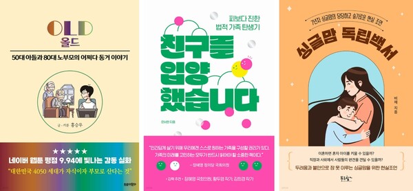 일간지에 연재된 가족생활만화 <비빔툰>으로 사랑받은 홍승우 작가의 에세이 <OLD 올드>는 2030세대 자녀와 여든이 넘은 노부모 사이에서 살아가는 4050세대의 희로애락을 다룬다. <친구를 입양했습니다>는 함께 살던 친한 친구를 성인 입양하여 서로에게 법적 울타리가 되어 준 신개념 가족의 이야기를 생생하게 담아내며, <싱글맘 독립백서>는 7년차 싱글맘이 한 부모 가족의 가장으로서 전하는 현실적 조언과 생활을 기록한 에세이다.