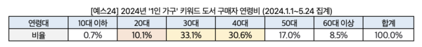 2024년 '1인 가구' 키워드 도서 베스트셀러 1위는 40만 유튜버 신아로미의 첫 에세이 <혼자서도 잘 사는 걸 어떡합니까>가 차지했다. 혼자 사는 삶의 즐거움을 오롯이 전하는 한편, '혼삶'이 아직 조금은 두려운 이들을 위해 준비해야 할 것 등을 구체적으로 설명한다. '1인 가구' 키워드 도서 전체 구매자 연령비와 마찬가지로, 3040세대 구매자 비율이 74%로 가장 높았다. 더불어 20대 구매자 비율이 17%로 뒤를 이으며 20대 유튜브 구독자들의 구매가 많았음을 짐작해 볼 수 있었다.