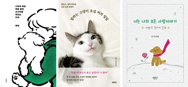 2024년 반려동물 에세이 베스트셀러 1~3위는 모두 2024년 출간된 신간들이었다. 1위 <너에게 배운 예를 들면 고구마를 대하는 자세>는 <글멍>으로 사랑받은 예예 작가의 두 번째 에세이집으로, 반려견 뭉게와 함께한 일상의 기록들을 통해 인간과 비인간을 넘어 한 존재와 존재로서의 성장기를 이야기한다. 2위 <말하는 고양이 호섭 씨의 일일>은 유튜브 '지금 숏츠에서 가장 주목받는 크리에이터'로 선정된 고양이 호섭 씨의 일상을 담았으며, 3위 <너는 나의 모든 사랑이야기>는 인스타툰 '사랑은 강아지 모양'을 연재 중인 유링 작가가 크레파스로 따스하게 그려 낸 사랑스러운 강아지 그림 에세이다