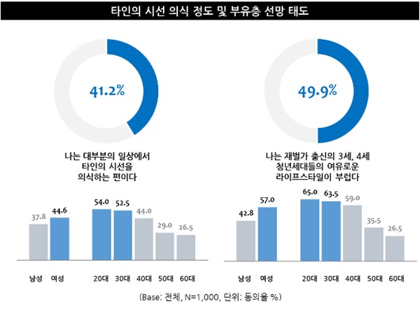 한편, 여성과 저연령층을 중심으로 ‘타인의 시선’을 의식하는 경향이 두드러진 결과를 보인 가운데, 재벌가 청년 세대들의 여유로운 라이프스타일을 선망하는 태도도 한층 뚜렷한 모습을 확인할 수 있었다(우측 그래프 참조). 현대사회에서 외부의 평가와 사회적 지위가 중요한 역할을 하고 있는 만큼, 개인의 이미지가 사회적 위치를 반영하는 수단으로 여겨지고 있기 때문으로 풀이된다.