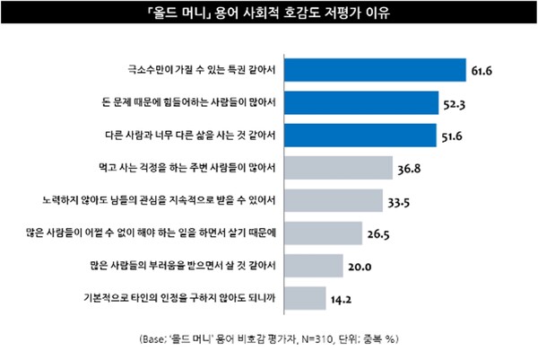 반면 올드 머니에 대한 사회적 호감도가 높을 것으로 예상하는 이유로는 꼭 돈에 얽매어 살지 않아도 될 것 같다(69.6%, 중복응답)는 점을 우선적으로 꼽았으며, 하고 싶은 것만 하고 살아도 되고(56.8%), 먹고 사는 걱정을 하지 않아도 된다(50.2%)는 응답이 뒤를 이었다. 돈 걱정 없이 살 수 있는 자유로운 삶에 대한 동경이 반영된 것으로 보여진다.