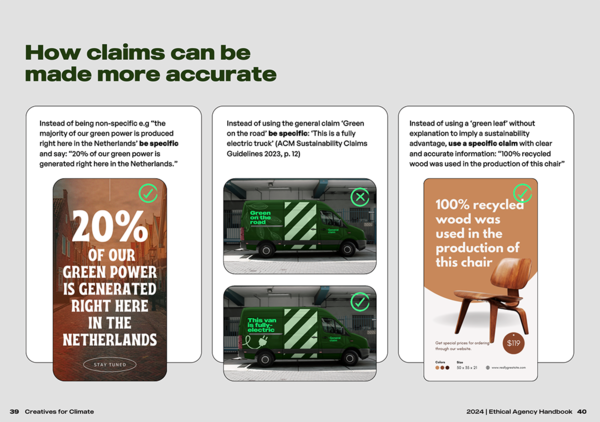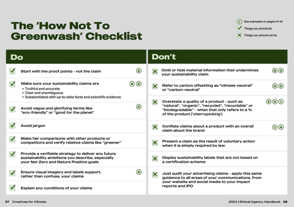 '그린워시를 하지 않는 방법'이라는 제목의 풀아웃에는 전문 용어 피하기, 공정한 비교하기, 미래 지속가능성 목표 달성에 대한 검증 가능한 전략 제공 등의 체크리스트가 포함되어 있다. 제품에 대한 주장을 브랜드에 대한 전반적인 주장과 혼동하지 않는 것이 핵심이다. 또한 프리마크, 유니레버, 오틀리, HSBC 등의 브랜드 최근 사례 연구도 포함되어 있다.