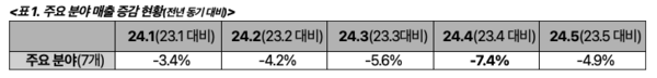 주요 분야 5월 매출, 전년 동기대비 4.9%↓… 올해 들어 5개월 연속 매출 감소세(월 최대 7.4%↓) 기록