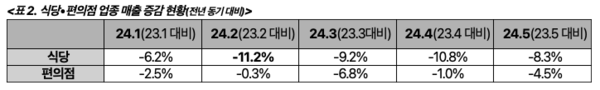 식당 매출, 전년 동기대비 최대 11.2%↓… 식사 대체 가능한 편의점 매출은 식당 대비 감소폭 낮아