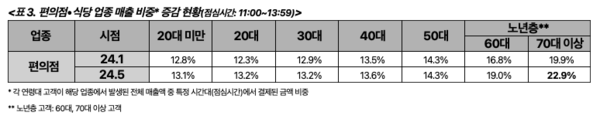 특히, 점심식사 시간에 편의점을 이용하는 노년층 고객의 매출 비중은 불과 4개월만에 최대 3%까지 상승한 것이 확인됐다. 반면, 20~50대 고객의 매출 비중은 기간 내 최대 1% 미만 상승하는 데 그쳤다.(표 3. 참고)