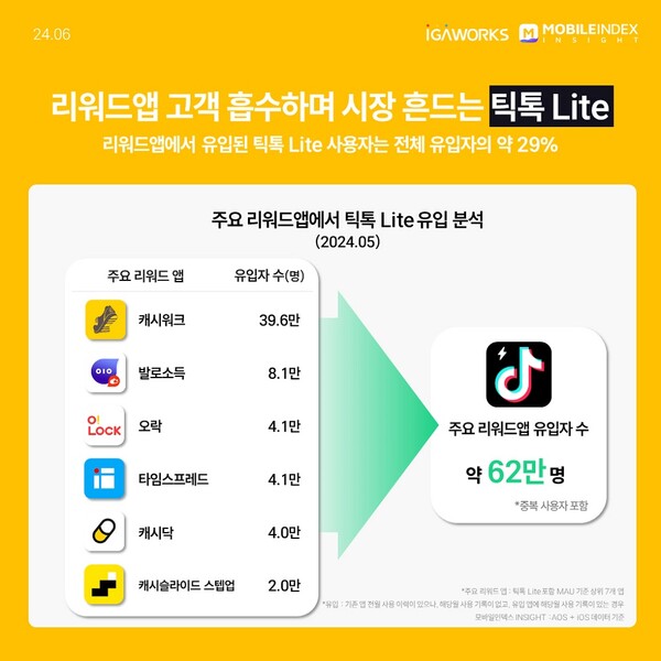 2024년 5월 기준 리워드앱에서 ‘틱톡 Lite’로 유입된 사용자 수는 약 62만 명(중복 사용자 포함)으로 확인됐다. ‘캐시워크’에서는 약 40만 명, ‘발로소득’에서는 약 8만 명의 사용자가 이동했다.