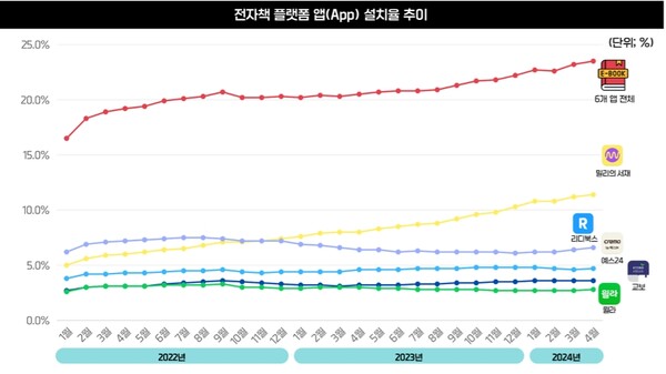 마크로밀 엠브레인 패널빅데이터®의 ‘전자책(eBook) 플랫폼’ 관련 분석에 따르면, 전자책 앱 설치율이 꾸준히 성장세를 유지하고 있는 가운데, ‘밀리의 서재’가 타 플랫폼 대비 가파른 증가 추이를 보이는 것으로 확인됐다(우측 그래프 참조). 압도적인 수의 전자책을 기반으로 AI 책 추천, 영상형 책 ‘오브제북’ 등 다양한 기능과 콘텐츠를 추가해 오던 밀리의 서재가 대표 전자책 플랫폼으로 자리 잡고 있음을 확인할 수 있는 결과였다.