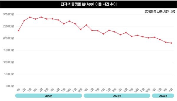 단, 전자책 플랫폼 설치율이 괄목할만한 성장세를 보인 것과 대조적으로 전자책 서비스 이용 시간이 소폭 낮아지는 경향을 보인 점은 주목할 만하다. 이는 사용자들이 앱 설치 후 실제로 독서에 할애하는 시간이 줄어들고 있음을 확인할 수 있는 결과로, OTT나 웹툰, 유튜브 등 다양한 오락 플랫폼이 등장하고, 점차 짧고 가벼운 콘텐츠에 익숙해지면서 전자책에 대한 집중도가 낮아지고 있는 것으로 짐작해 볼 수 있었다. 더불어 전자책 플랫폼 이용시간이 감소하고 있는 배경에는 독서 패턴이 달라지고 있는 것도 관련이 있어 보였다. 전자책 이용 시간이 약 17분(1일 평균) 정도로 긴 시간동안 집중해서 읽기 보다는 자투리 시간동안 ‘짧고 가볍게’ 읽다보니 평균적으로 이용하는 전자책 이용 시간 역시 감소하고 있는 것으로 해석해볼 수 있었다(1개월 총 사용: 3시간). 간단한 콘텐츠를 선호하는 경향이 뚜렷해지고 있는 만큼 앞으로 사용자들의 변화된 독서 패턴에 맞춘 전략도 더욱 필요할 것으로 보인다.