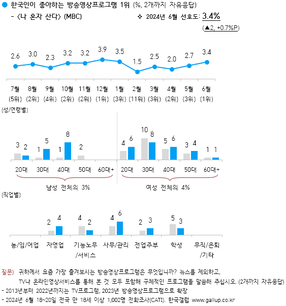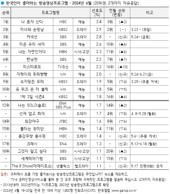 한국갤럽이 2024년 6월 18~20일 전국 만 18세 이상 1,002명에게 요즘 가장 즐겨보는 방송영상프로그램을 물은 결과(2개까지 자유응답), MBC 싱글라이프 예능 〈나 혼자 산다〉가 선호도 3.4%로 6개월 만에 1위 복귀했다.