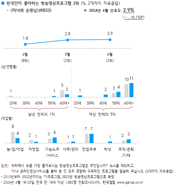 KBS2 주말극 〈미녀와 순정남〉(2.9%)이 선호 방송영상프로그램 두 달 연속 2위이다. 톱배우에서 밑바닥으로 추락한 ‘박도라’(임수향)와 그를 일으켜 세우는 드라마PD ‘고필승’(지현우)의 로맨틱 코미디로, 이 드라마를 쓴 김사경 작가의 전작 〈신사와 아가씨〉(KBS2 주말, 2021년 11월~2022년 3월), 〈하나뿐인 내편〉(KBS2 주말, 2019년 2·3월)은 선호 프로그램 1위에 오른 바 있다.
