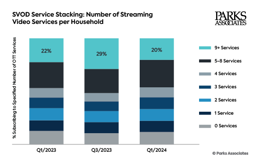 2024년 1분기 미국 인터넷 가구의 20%가 9개 이상의 서비스에 비용을 지불한다고 답한 반면, 2023년 3분기에는 29%에 그쳤다. 가구당 평균 스트리밍 동영상 서비스 구독 건수는 5개 이하로 감소했으며, 지난 12개월 동안 서비스를 해지한 가구의 32%는 그 이유로 가계 지출을 줄이기 위해서라고 답했다.