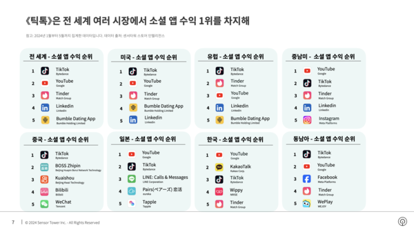 전 세계 및 주요 국가의 소셜 앱 수익 순위를 살펴보면 ‘틱톡’의 성과가 눈에 띈다. 전 세계, 미국, 유럽, 중국, 동남아에서 ‘틱톡’은 수익 1위에 올랐으며, 한국, 일본, 중남미에서도 각각 상위권을 차지하며 소셜 앱 시장을 이끌고 있음을 증명했다.