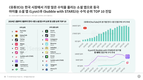 한국 소셜 앱 시장에서 ‘틱톡’은 수익 순위 3위, 수익 성장 순위 2위에 오르며 성과를 보였다. 수익 순위 1위는 지속적인 성장세를 보인 ‘유튜브’가 차지했다. 한국 시장에서는 특히 다른 주요 시장과는 다르게 아이돌 소셜 앱 ‘리슨’과 ‘bubble with STARS’가 수익 순위 상위권에 진입했다는 점도 눈에 띄었다.