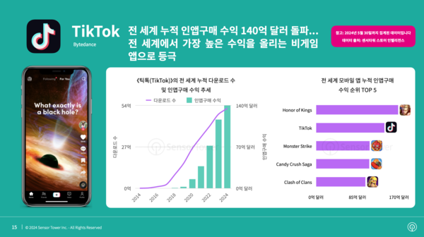 ‘틱톡’은 ‘왓츠앱 메신저’, ‘페이스북’, ‘인스타그램’ 등 주요 소셜 앱과 비슷한 다운로드 수를 보이지만 인앱구매 수익 방면에서는 다른 소셜 앱을 압도하고 있다. ‘틱톡’의 2024년 3월 인앱구매 수익은 4억5000만달러로 사상 최고치를 기록하는 등 계속 성장하고 있다.