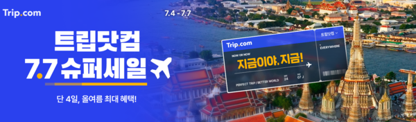 글로벌 원스톱 여행 플랫폼 트립닷컴은 오는 4일부터 <7.7 슈퍼세일(Super Sale)>을 시작한다고 밝혔다. 행사는 7일까지 총 4일간 진행되며 선착순으로 다운받을 수 있는 할인코드와 반짝 특가를 위한 알림 설정은 지금부터 가능하다.