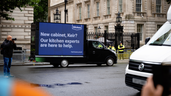 '새 캐비닛?' 광고는 7월 5일 금요일 단 하루 동안만 진행되며, 1735년부터 영국 수상들이 거주한 곳으로 세계적으로 유명한 웨스트민스터의 다우닝 스트리트 외부에 광고 밴이 등장했다.