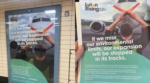 올해 초 더 뉴 스테이츠맨(The New Statesman) 잡지와 런던 지하철 포스터에 실린 루턴 공항 광고에는 항공기 경비원이 항공기에 신호를 보내는 이미지와 "우리가 환경적 한계에 도달하지 못하면 우리의 확장은 중단될 것이다."라는 카피가 있다.