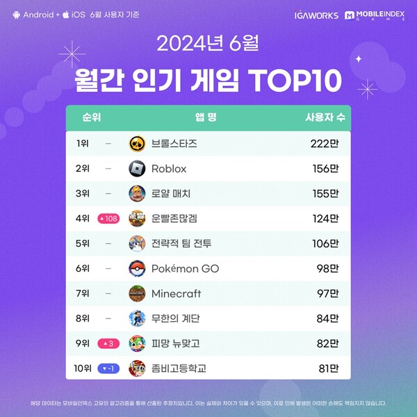 모바일인덱스GAME에 따르면, ‘브롤스타즈’는 약 222만 명의 월간 사용자 수(MAU)로 2024년 6월 인기 게임 순위 1위에 등극했다. 2위는 ‘ROBLOX’(약 156만 명), 3위는 ‘로얄 매치’(약 155만 명)으로 분석됐다.