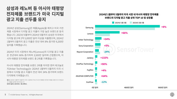 2024년 미국 시장에서 레노버의 디지털 광고 지출은 전년 대비 66% 증가하며 3500만달러에 근접했으며, 아시아 태평양 전자제품 브랜드 중 2위를 기록했다. 아시아 태평양 전자제품 브랜드 3위를 차지한 앤커 테크놀로지는 2024년 1월부터 5월까지 미국 시장에서 디지털 광고 지출이 전년 대비 34% 증가하며 브랜드 다각화에 기여했다.