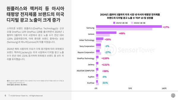 2024년 1월부터 5월까지 미국 시장 내 아태 전자제품 브랜드의 디지털 광고 노출 수에서도 삼성과 레노버는 각각 1위, 2위를 차지했다. 스마트폰 브랜드 원플러스는 신규 모델 ‘OnePlus 12’와 ‘OnePlus 12R’을 출시하면서 광고 노출 수가 전년 대비 120% 급증하며 아태 휴대폰 브랜드 중에서는 삼성과 레노버의 뒤를 이었다.