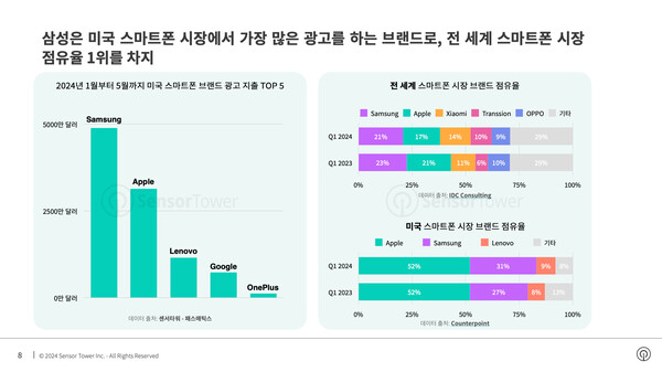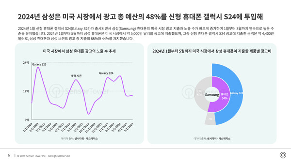 2024년 1월 신형 휴대폰 갤럭시 S24가 출시되면서 삼성 휴대폰의 미국 시장 광고 지출과 노출 수가 빠르게 증가하며 1월부터 3월까지 연속으로 높은 수준을 유지했다. 2024년 1월부터 5월까지 삼성 휴대폰은 미국 시장에서 약 5000만달러를 광고에 지출했으며, 그중 신형 휴대폰 갤럭시 S24 광고에 지출한 금액은 약 4400만달러로, 삼성 휴대폰과 삼성 브랜드 광고 총 지출의 88%와 44%를 차지했다.