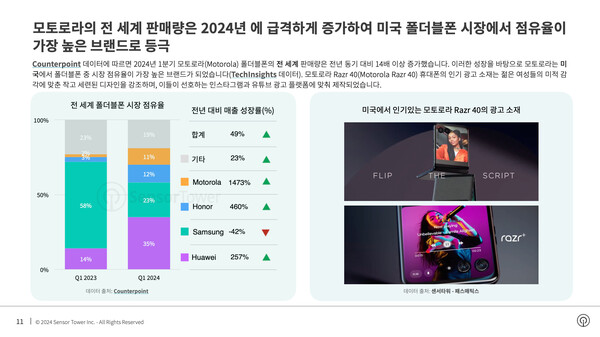 2024년 1분기 모토로라 폴더블폰의 전 세계 판매량은 전년 동기 대비 14배 이상 증가했다. 이러한 성장을 바탕으로 모토로라는 미국 폴더블폰 시장에서 점유율이 가장 높은 브랜드가 됐다. 모토로라 Razr 40 휴대폰의 인기 광고 소재는 젊은 여성들의 미적 감각에 맞춘 작고 세련된 디자인을 강조하며, 이들이 선호하는 인스타그램과 유튜브 광고 플랫폼에 맞춰 제작됐다.
