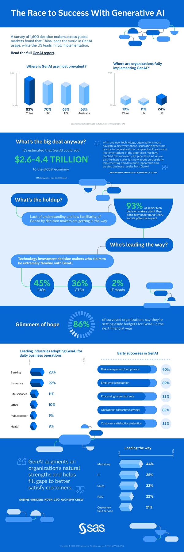 SAS 수석부사장 겸 CTO인 브라이언 해리스(Bryan Harris)는 "조직에서 신기술을 도입할 때 과장된 부분과 실제를 분리하는 발견 단계를 거쳐야 하는데, 생성형 AI를 통해 이 부분이 이미 검증되었다"면서 "과대 포장의 사이클에서 벗어남에 따라, 이제는 생성형 AI를 통해 반복 가능하고 신뢰할 수 있는 비즈니스 결과를 의도적으로 구현하고 제공하는 것이 중요하다"라고 말했다.