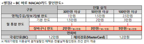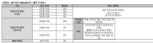 BC 바로 MACAO카드는 실생활에서 필수 지출로 분류되는 주유비와 장보기 비용에 대해 결제단가가 커질수록 보다 큰 할인 혜택을 제공한다.