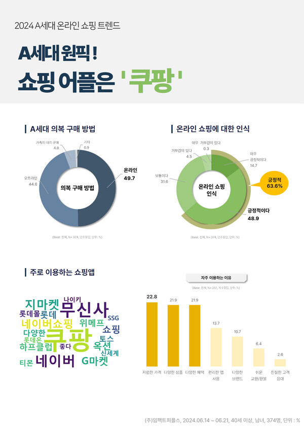 시니어 소셜벤처 임팩트피플스는 2024년 6월 14일부터 2024년 6월 21일까지 40세 이상 남녀 374명을 대상으로 온라인 쇼핑 트렌드에 대한 조사를 실시했다.