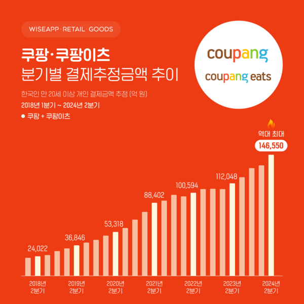 와이즈앱·리테일·굿즈가 만 20세 이상 한국인이 신용카드, 체크카드, 계좌이체, 소액결제 등으로 결제한 금액을 표본조사한 결과, 쿠팡과 쿠팡이츠의 올해 2분기 합산 결제추정금액은 14조 6,550억 원으로 작년 동기 11조 2,048억 원 대비 31% 증가한 것으로 조사됐다.