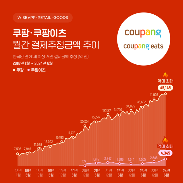 한편, 쿠팡과 쿠팡이츠의 올해 6월 결제추정금액은 4조 5,145억 원과 4,345억 원으로 각각 추정되어, 전년 동월 대비 쿠팡은 23%, 쿠팡이츠는 189% 증가한 것으로 나타났다.