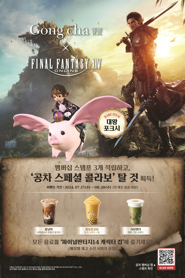 '파이널판타지14'는 탄탄한 세계관과 매력적인 캐릭터로 세계적으로 인기가 높은 MMORPG 게임이다. 이번 협업은 공차코리아가 처음으로 시도하는 게임 컬래버로, 공차 소비자들과 파이널판타지14 유저들에게 색다른 즐거움과 혜택을 제공하고자 기획됐다.