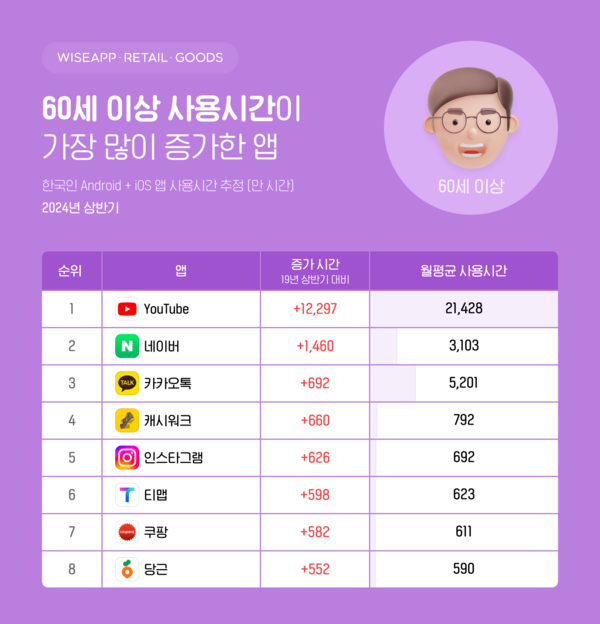 5년 전과 비교하여 60세 이상에서 앱 사용시간이 가장 많이 증가한 앱은 유튜브로 5년 간 1억 2,297만 시간 증가하여 24년 상반기 평균 2억 1,428만 시간을 기록했다.