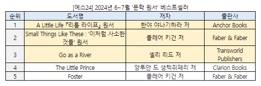 올여름 문학 원서 베스트셀러 1위에 오른 작품은 SNS 역주행 화제작 <리틀 라이프>의 원서인 <A Little Life>였다. 2024년 1~7월 판매량이 전년 동기 대비 약 47배 폭증했다. 올해 문학 분야에서 돌풍을 일으킨 클레어 키건 <이처럼 사소한 것들>의 원서 <Small Things Like These>가 2위를 차지했고, 역시 올해 1~7월 판매량이 전년 동기 대비 약 38.6배 급증했다. 3위는 이동진 평론가가 3월 '이달의 최고의 책'으로 추천한 <흐르는 강물처럼>의 원서 <Go as a River>였다. 지난 4월 원서 출간 이후 6월에 122.2%, 7월에 90.7%의 판매 성장률을 기록하며 인기가 이어지고 있다.