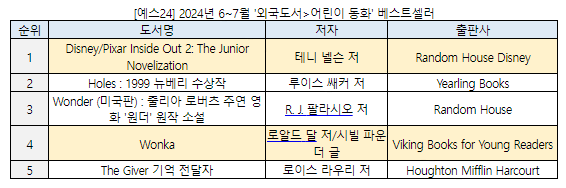 지난 6월 개봉한 영화 '인사이드 아웃 2'를 동화로 읽는 <Disney/Pixar Inside Out 2: The Junior Novelization>은 올여름 어린이 동화 원서 베스트셀러 1위를 차지했다. 영화 개봉 첫 주(6.12~18)에 전주 대비 641.7%, 둘째 주(6.19~25)에 28.1% 판매량이 급증했다. 4위에 오른 '웡카'의 원작 소설 <Wonka>는 올 1월 말 영화 개봉과 함께 2월 1주부터 3월 2주까지 연속 6주간 예스24 외국도서 종합 베스트셀러 1위 기록을 세운 바 있다. 그 외 <Holes>와 <Wonder> 등 영화 원작 스테디셀러도 상위권에 자리했다.