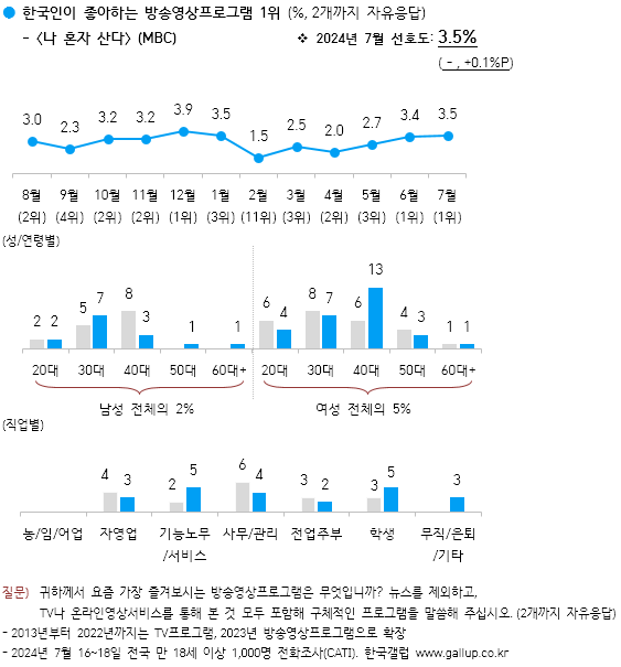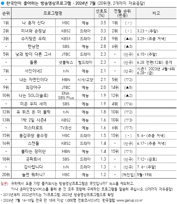 한국갤럽이 2024년 7월 16~18일 전국 만 18세 이상 1,000명에게 요즘 가장 즐겨보는 방송영상프로그램을 물은 결과(2개까지 자유응답), MBC 싱글라이프 예능 〈나 혼자 산다〉가 선호도 3.5%로 두 달 연속 1위를 차지했다.