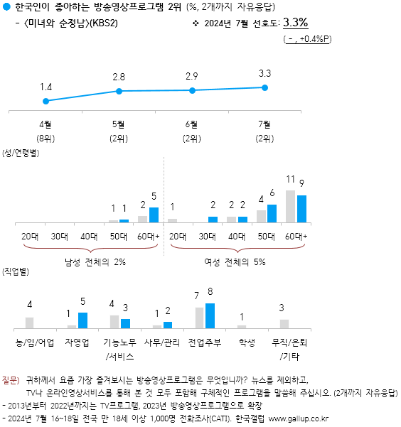 KBS2 주말극 〈미녀와 순정남〉(2.9%)이 선호 방송영상프로그램 두 달 연속 2위에 올랐다. 톱배우에서 밑바닥으로 추락한 ‘박도라’(임수향)와 그를 일으켜 세우는 드라마PD ‘고필승’(지현우)의 로맨틱 코미디이다.