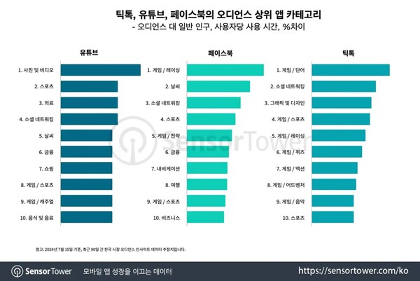센서타워 오디언스 인사이트에 따르면, 한국 《틱톡》 사용자들은 일반 인구에 비해 훨씬 더 많은 시간을 게임 카테고리에 소비하는 것으로 나타났습니다. 한국 《틱톡》 사용자가 일반 인구에 비해 사용 시간이 높은 상위 10개 앱 카테고리 중 ‘게임 / 단어(+106%)’, ‘게임 / 스포츠(+81%)’ 등 7개가 게임 카테고리였습니다. 이는 다른 상위 소셜 미디어 플랫폼인 《유튜브》가 상위 10개 중 2개만이 게임 카테고리라는 점, 그리고 《페이스북》은 3개, 《인스타그램》은 한 개도 없다는 점에서 극명한 대조를 이룹니다.
