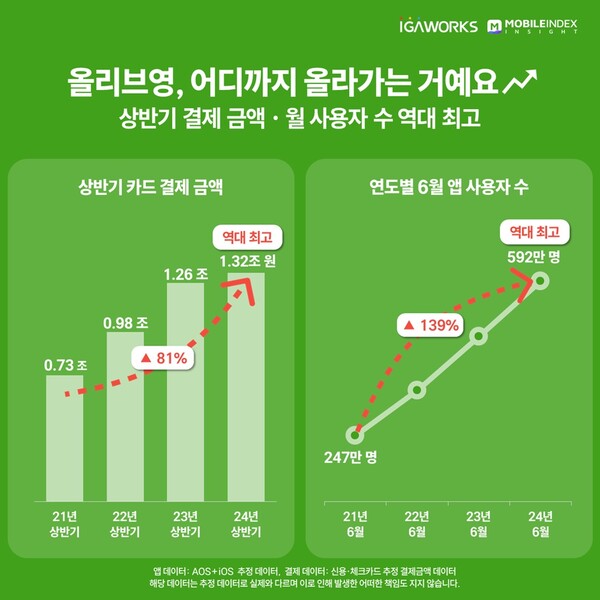 올리브영’의 2024년 상반기 카드 결제 금액은 2021년(0.73조) 대비 약 81% 증가한 약 1.32조 원으로 역대 최고치를 기록했다. 2024년 6월 월간 사용자 수(MAU)는 약 592만 명에 달했으며, 이는 2021년 동월 대비 약 139% 상승한 수치이다.