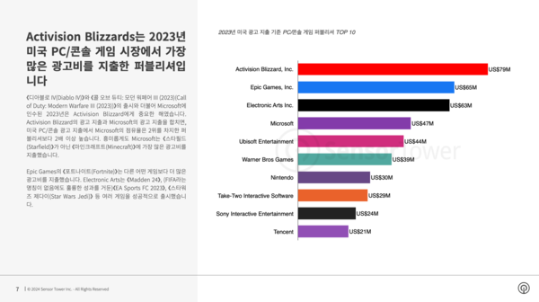 액티비전 블리자드(Activision Blizzards)는 약 8000만달러로 2023년 미국 PC/콘솔 게임 시장에서 가장 많은 광고비를 지출한 퍼블리셔였다. ‘디아블로 IV’와 ‘콜 오브 듀티: 모던 워페어 III’의 출시와 더불어 마이크로소프트(Microsoft)에 인수된 2023년은 액티비전 블리자드에게 중요한 해였다. 액티비전 블리자드의 광고 지출과 마이크로소프트의 광고 지출을 합치면, 미국 PC/콘솔 광고 지출에서 마이크로소프트의 점유율은 2위를 차지한 퍼블리셔보다 2배 이상 높았다. 에픽게임즈(Epic Games)의 ‘포트나이트’는 다른 어떤 게임보다 더 많은 광고비를 지출했다. 일렉트로닉 아츠(Electronic Arts)는 ‘Madden 24’, ‘EA Sports FC 2023’ 등 여러 게임을 성공적으로 출시했다.