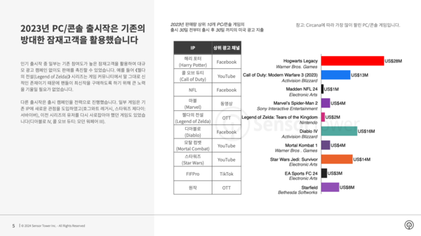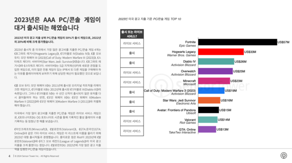 2023년은 AAA PC/콘솔 게임이 대거 출시되는 해였다. 2023년 미국 광고 지출 기준 상위 10개의 PC/콘솔 게임을 살펴보면, 50%가 출시 게임으로 2022년의 20%에 비해 크게 증가했다. 미국에서 가장 많은 광고비를 지출한 2023년 출시작 4개는 ‘호그와트 레거시(Hogwarts Legacy)’, ‘디아블로 IV(Diablo IV)’, ‘콜 오브 듀티: 모던 워페어 III(2023)(Call of Duty: Modern Warfare III (2023))’, ‘스타워즈 제다이: 서바이버(Star Wars Jedi: Survivor)’였다.
