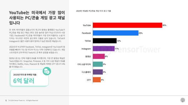 유튜브는 미국에서 가장 많이 사용되는 PC/콘솔 게임 광고 채널이었다. 페이스북은 PC/콘솔 게이머들이 가장 먼저 떠올리는 소셜 미디어는 아니지만 여전히 광고계의 거물로 남아 있었으며, 틱톡과 인스타그램도 젊은 사용자층의 참여도가 높은 중요한 채널이었다. 2022년과 비교하면 페이스북, 틱톡, 인스타그램은 유튜브의 점유율을 빼앗아 가는 등 미디어 믹스는 더욱 다양해지고 있다.