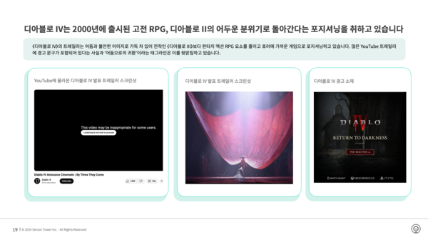 ‘디아블로 IV’는 대규모 오픈 베타 캠페인과 출시 후 캠페인에 막대한 지출을 진행하며 전략적인 광고 캠페인을 진행했다. 출시 전 ‘디아블로 IV’는 채널별로 서로 다른 광고 소재 전략을 채택했다. 게임플레이와 빌리 아일리시의 ‘You Should See Me in a Crown’을 소재로 한 틱톡 광고가 가장 인기 있었다. 유튜브에서는 실사 광고에 중점을 두었으며, 시네마틱 광고 소재도 사용했다. 출시 후 1주일, 모든 인기 채널의 광고 소재는 ‘디아블로 IV’에 찬사를 보내는 리뷰를 활용하는 데 집중했다. 이 캠페인의 페이스북 비중은 초기 출시 캠페인보다 훨씬 더 높았다.