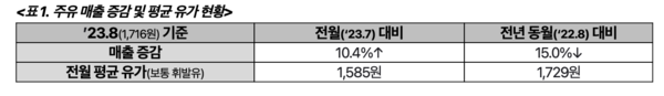 8월 평균 유가(일반 휘발유) 전월比 8.3% 상승… 同기간 주유 매출 10.4% 급증